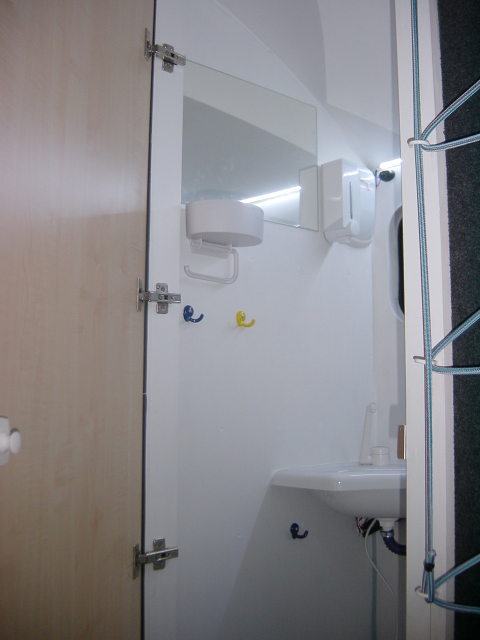 Sitzfläche dienen mit Kork belegt und mit Kantenschutz versehen. Staukasten nach innen mit einer Wand verschlossen. WC-Bad Spiegel und Beleuchtung installiert. Links neben dem Durchgang nach vorn besteht die Möglichkeit Zeltgestänge, Angel und Sonnenschirm mit Gummispannbändern an den eingeschraubten Haken zu befestigen. Das kleine Podest auf dem Batteriekasten ermöglicht es, dass der Batteriekasten geöffnet werden kann ohne jedes Mal die an der Wand befestigten Gegenständer zu entfernen. Auch wird unter dem Podest die Raumluft abgesaugt zur Heizung. Die Heizluft wird dann durch das viereckigen Rohrstück in Bodennähe wieder in den Wohnraum eingeblasen. |