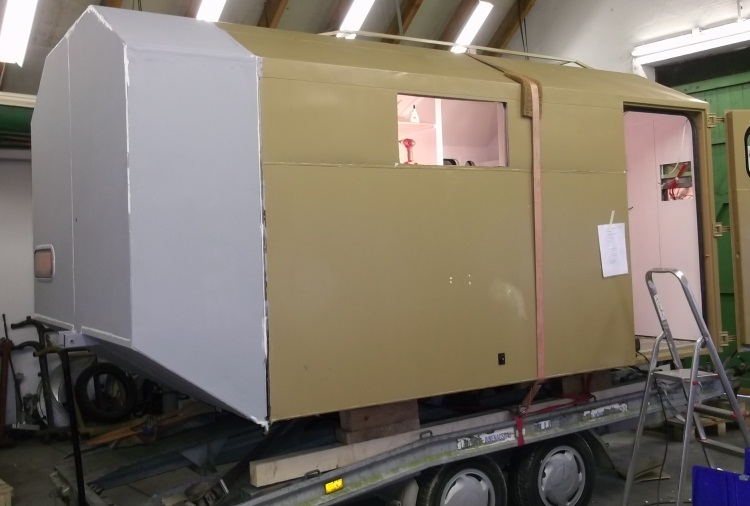 erstellten Plan durchgeführt. Hierbei habe ich an mehreren Punkten die Masse von der Karosserie genommen um nicht soviel Kabel ziehen zu müssen. Dann Isolierung mit 20 mm Styropor eingebracht. Nachdem der Haftgrund abgetrocknet war, wurde außen ein erster Voranstrich aufgerollt. Wehrmachtsbeige, voll matt. Der Durchgang nach vorn wurde provisorisch mit einer Hartfaserplatte verschlossen, da ich morgen in die Schlosserei fahre um dort die Rückwand zu erstellen. Deshalb habe ich auch zuerst die beiden Dachluken wieder eingebaut. Auch die Original Fenster vorn in der Tür und links sind drin. War eine anstrengende Arbeit für drei Personen weil die Dichtungen so verhärtet waren. |